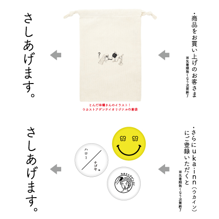 ・ご来店時にukaの会員プログラムukainnのマイページのご提示、またはその場で入会いただいた方に、ウカストアゲンテイ缶バッジをプレゼント。