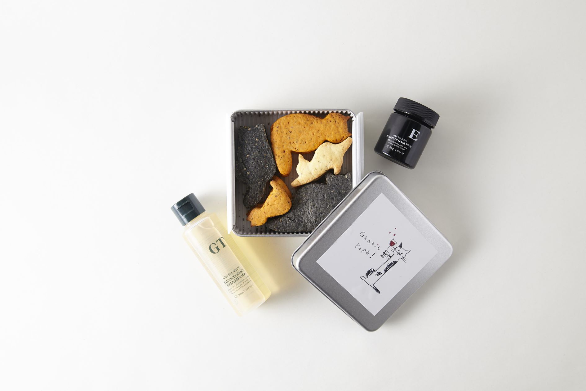 父の日限定三毛猫クッキーと爽快なジントニックを思わせる爽やかな香りのシャンプーに、マットな質感でボリュームを叶えるヘアワックスをセットに。