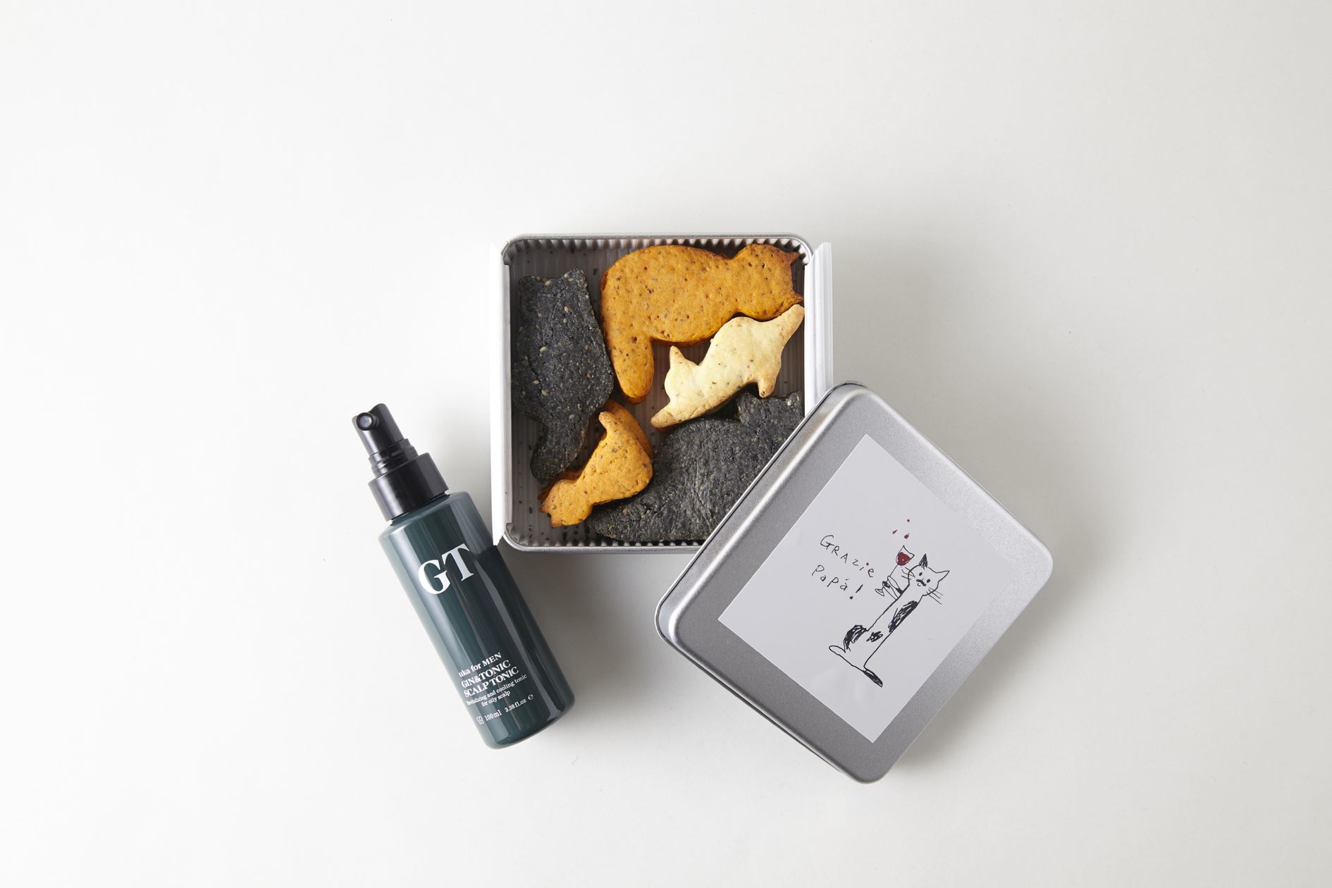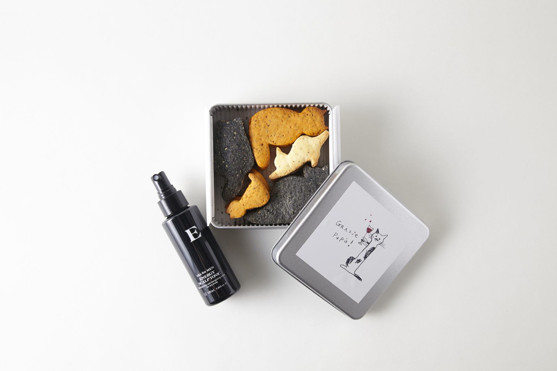 父の日限定三毛猫クッキーと、メンソールの冷感が心地よいスカルプトニックをセットに。