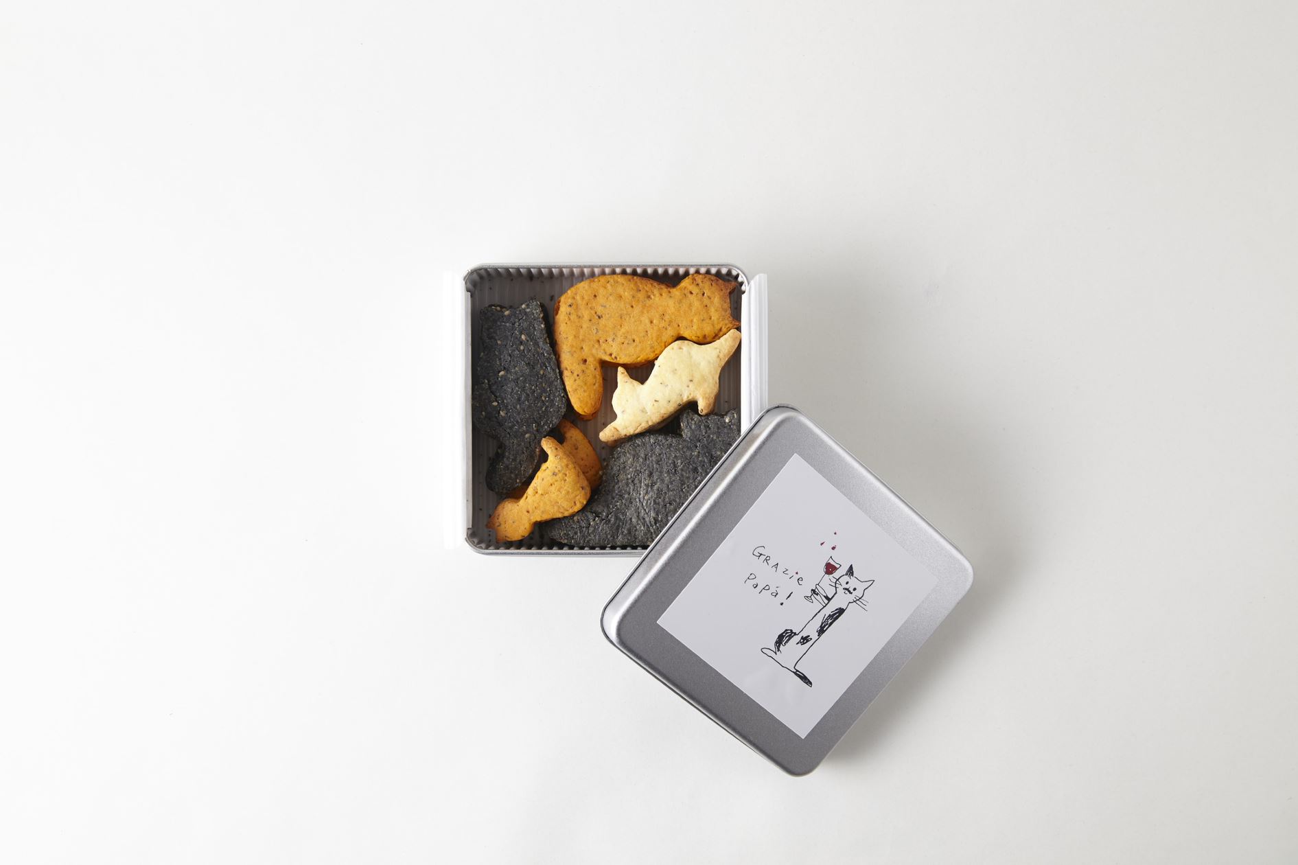母の日に限定発売したピンクの三毛猫クッキーに続き、父の日はお酒に合う3種類のフレーバーをご用意。ブラックペッパーチーズ(白猫)、トマトハーブ(オレンジ猫)、セサミ(黒猫)のラインナップで5種類のポーズの猫ちゃんが缶に入っています。