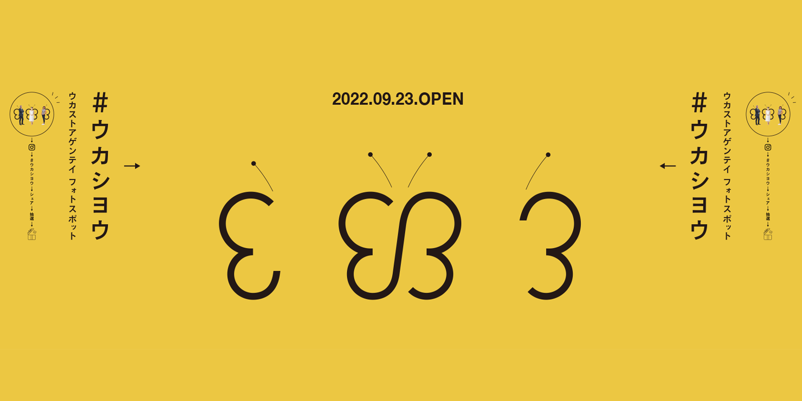チョウのハネの前でポーズを決めたらハイチーズ。お一人でもカップルでもみんなでも。インスタグラムに「#ウカシヨウ」をつけて投稿していただいた方の中から、抽選で商品をプレゼントします。