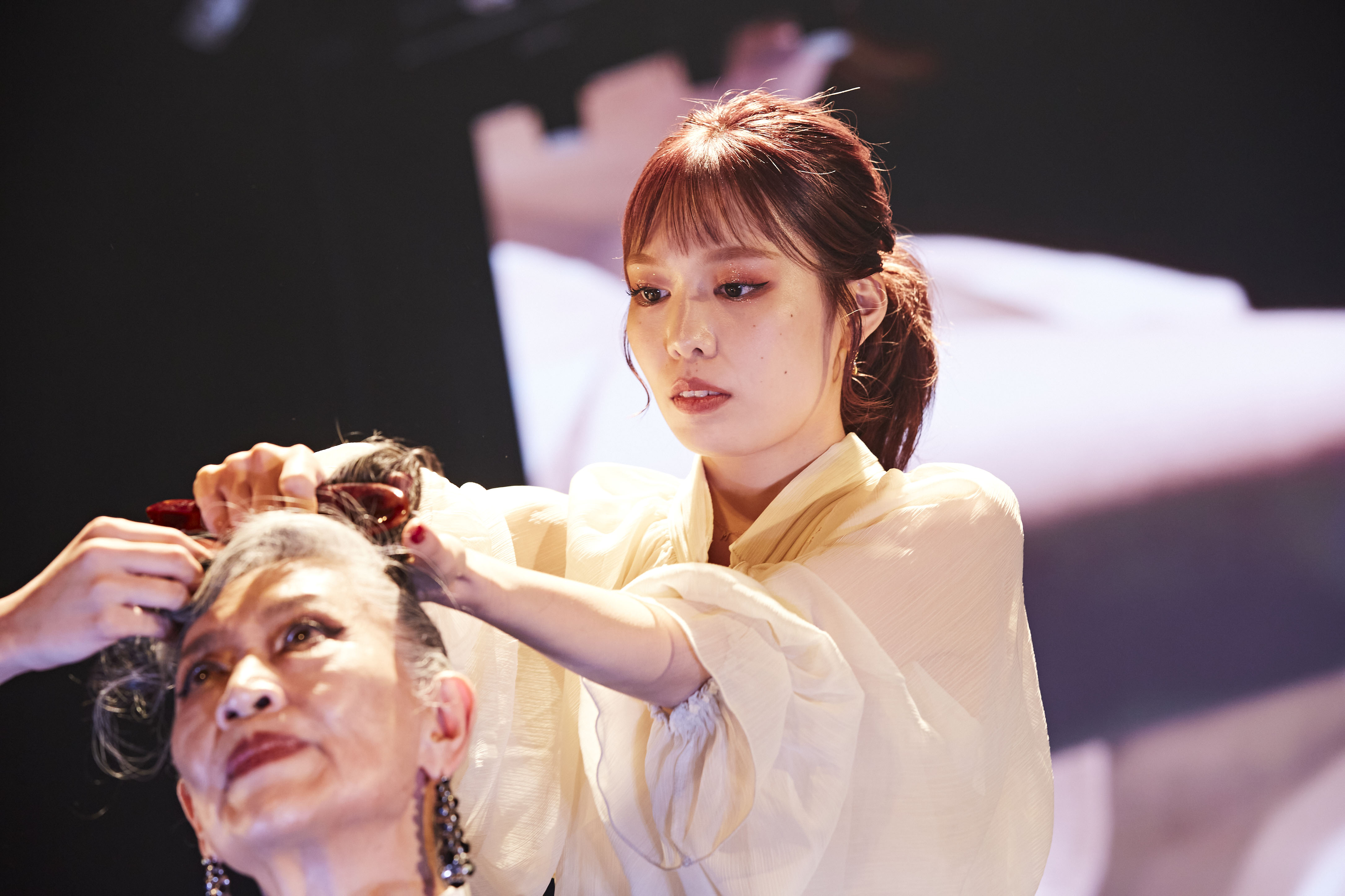ukaのステージパフォーマンスではuka 東京ミッドタウン 六本木の田中真里菜が登壇。グレイヘアのモデルを起用したステージのテーマは『結 Close』。ピアノの音色をバックに、モデル1体とアシスタント1名だけでクラシカルなヘアスタイルを完成させました。