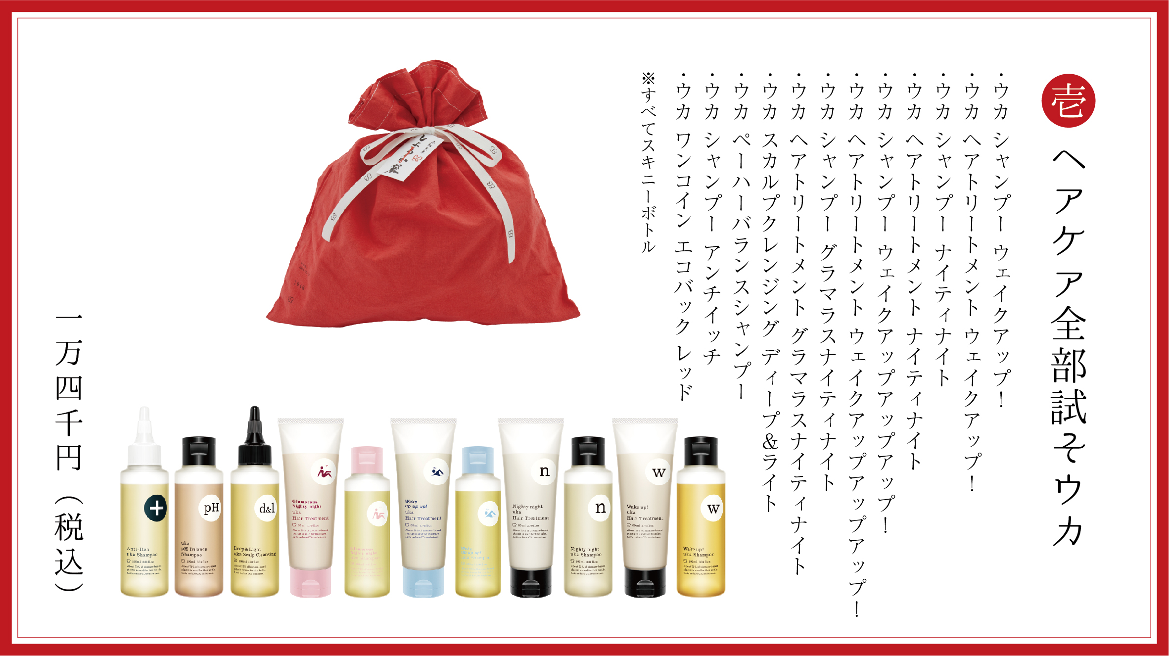 ukaのシャンプー&ヘアトリートメントが一つになった贅沢なセット。その日の気分で香りや仕上がりが選べます。スマートなスキニーボトルは旅行時にも便利。