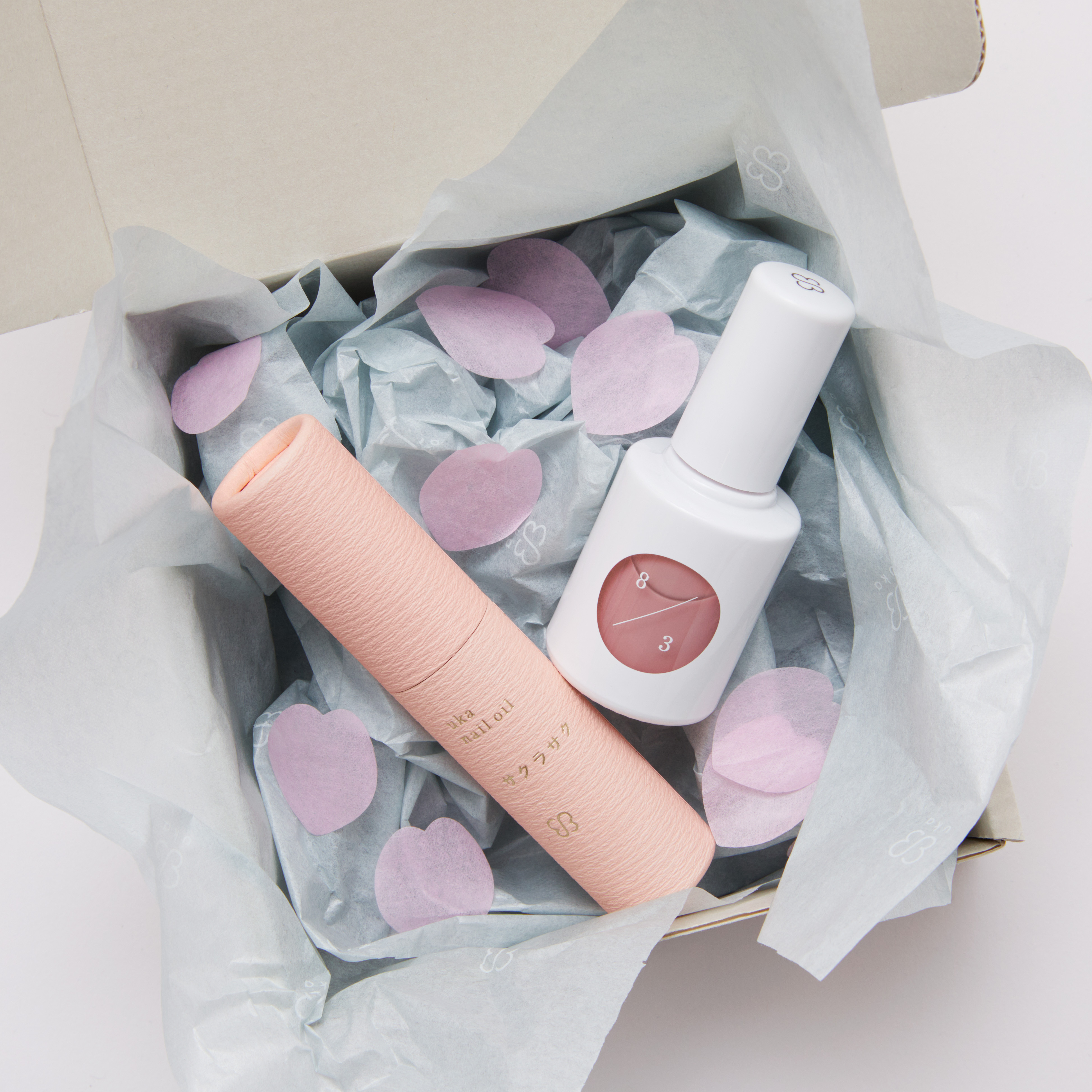 ギフトボックスもサクラの花びらをちりばめたラッピングでサクラサク仕様に。