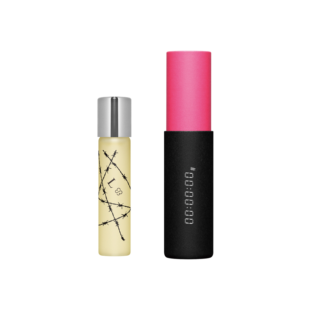 パッケージの数字は、黒色を16進数で表したもの。黒は#000000になるため、ukaの時刻表現と当てはめ#00:00:00 としています。内筒は LIMI feu のショッパーと同色の蛍光ピンクに、ボトルにはテキスタイルで使用した有刺鉄線のモチーフを印刷し、ネイルオイルのキャップはシルバーで仕上げました。ブラックローズにインスパイアされて選ばれたのは、ローズ、ブラックペッパー、ジャスミン、イランイランをブレンドした香り。LIMI feu のディスクリプションと同じように、付ける人の個性と溶け合う余白を残します。