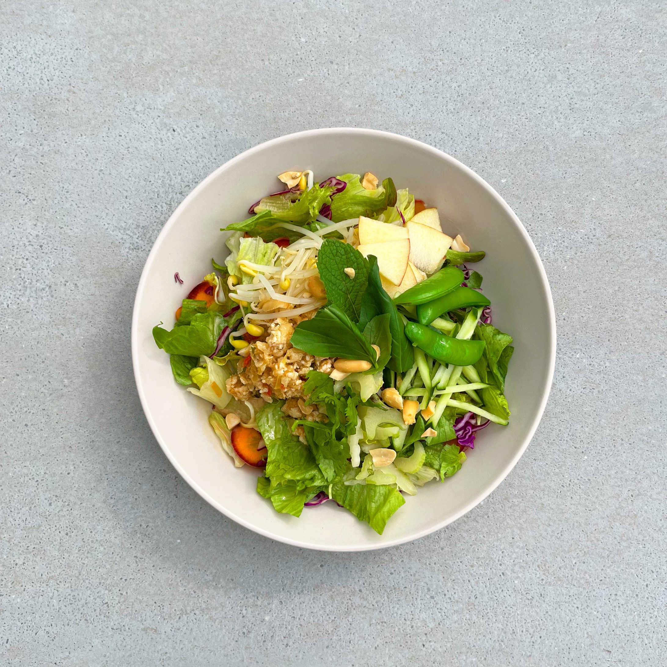 5月のサラダボウルはみさきキャベツ、レタス、パープル人参、スナップエンドウなどを使用したアジアンチキンサラダです。