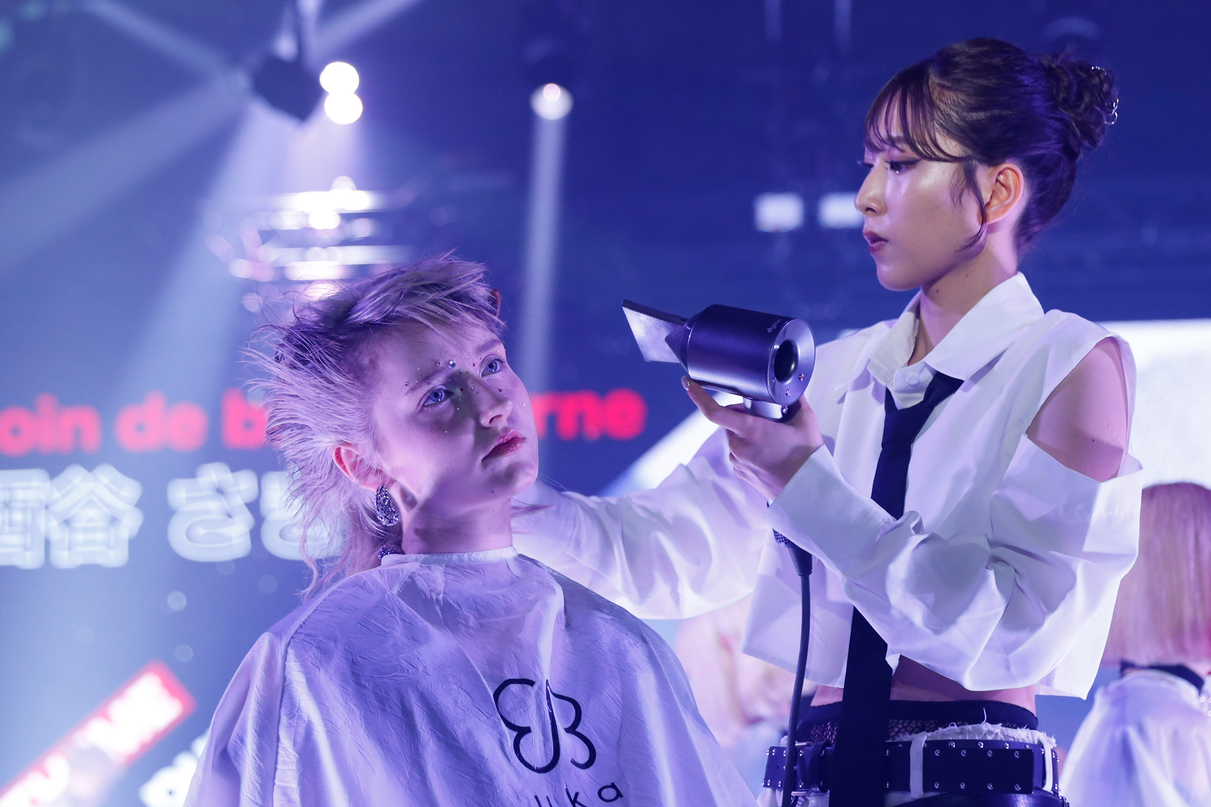 全体のテーマは”MOVE”。11サロンのアシスタントたちが同時に舞台に登場し、それぞれのテーマでカットしていきました。ukaの旭のテーマは”breaking boarders”。国境、性別、文化、あらゆる”境界”を超え、固定概念にとらわれないスタイルを表現しました。