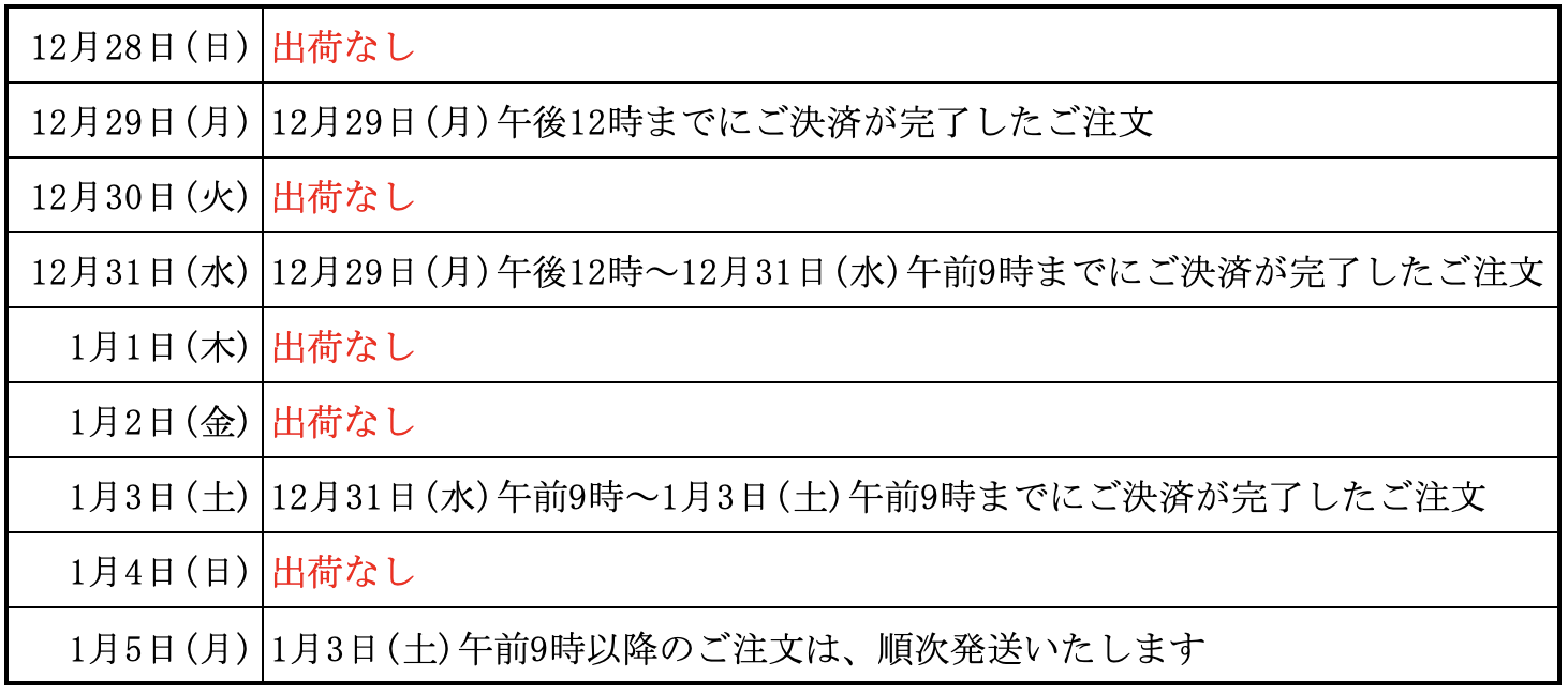12月31日(水)午前9時~1月3日(土)午前9時までにご決済が完了したご注文:1月3日(土)発送