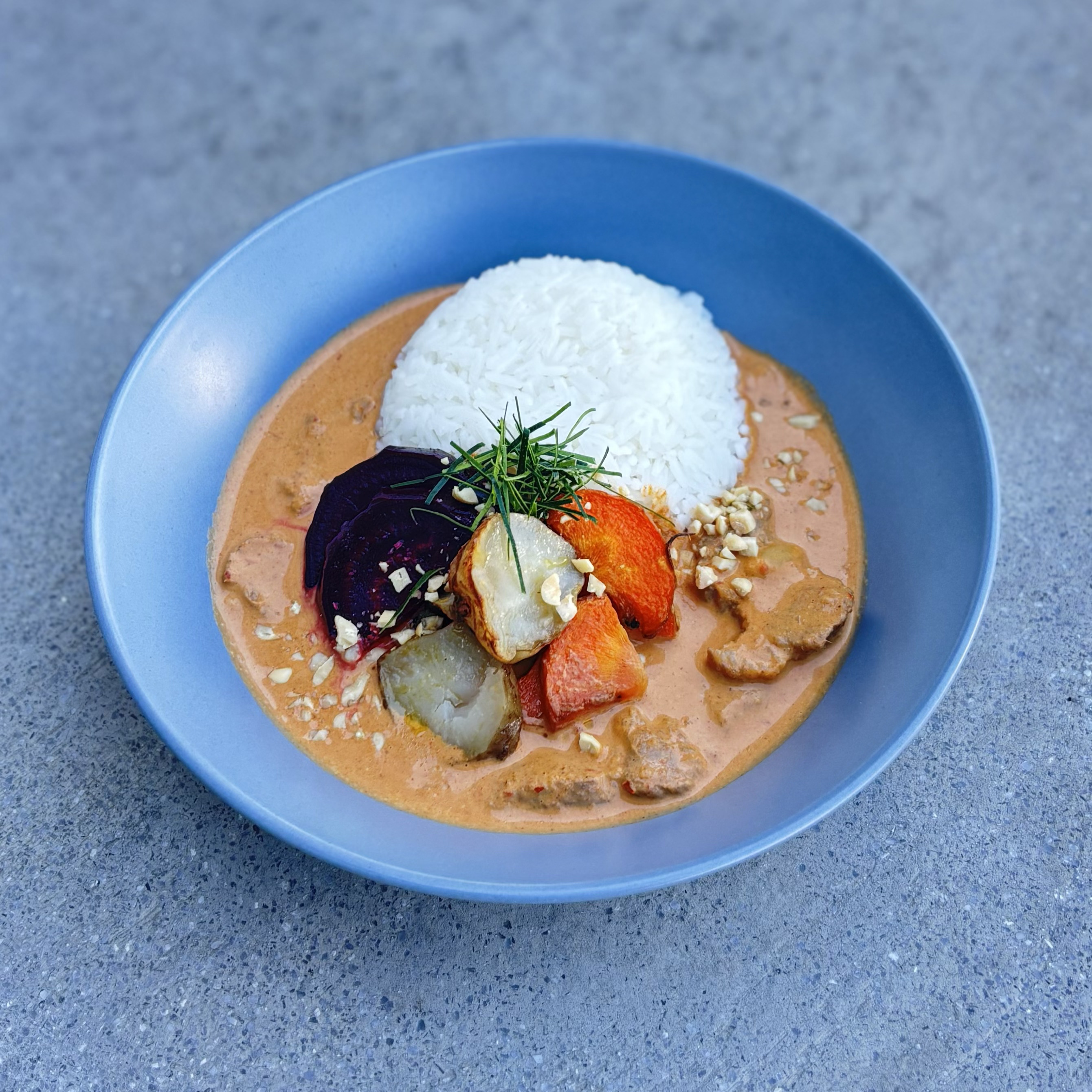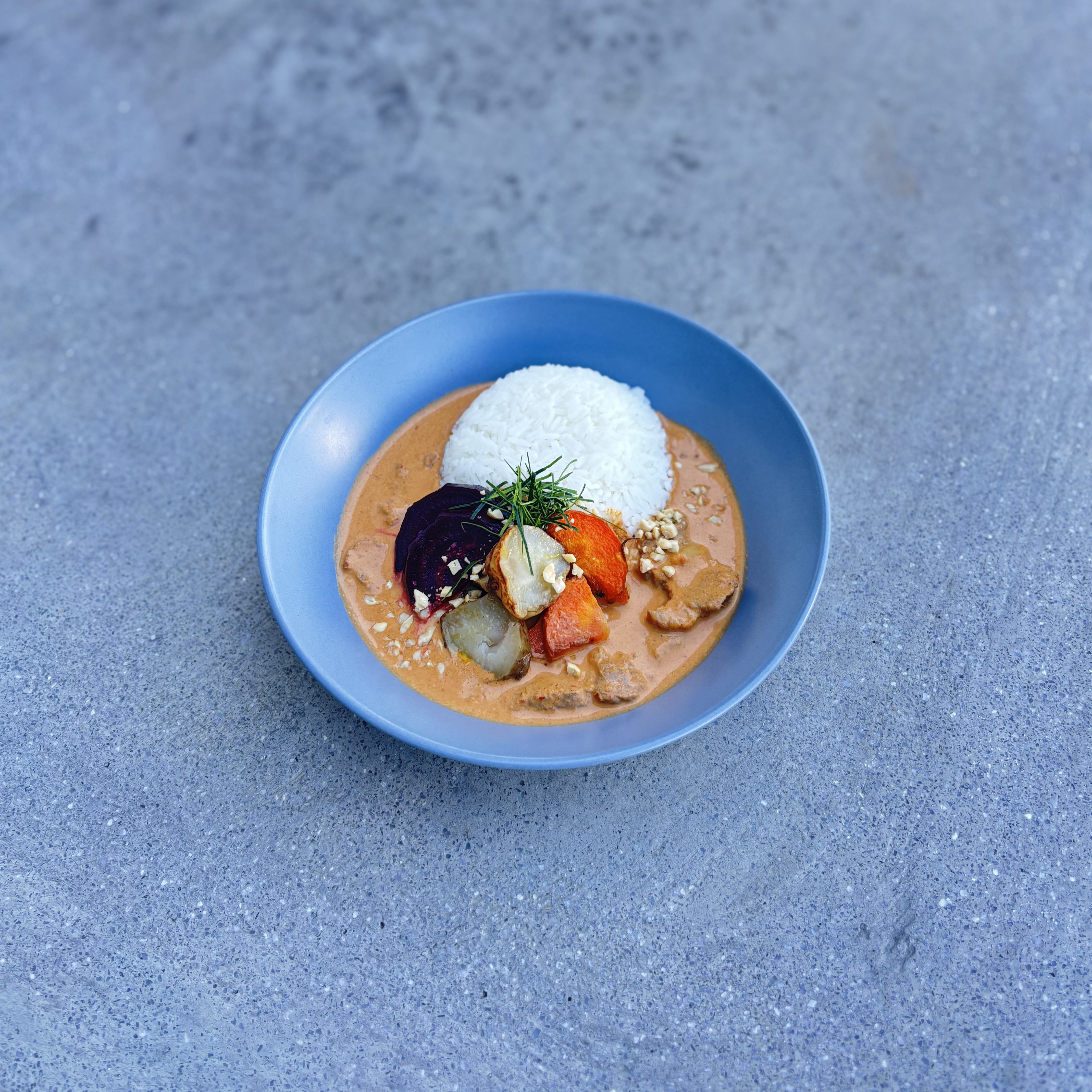 パネーンカレーは辛さの中にもココナッツミルクのコクやピーナッツの香ばしい風味のある濃厚なトロッとしたカレー。カフェアライムの爽やかな香りが特徴です。完一さんの栄養価の高い無農薬野菜、菊芋・にんじん・ビーツ使用。 ※アレルゲン:エビ、豚、ピーナッツ ※写真はイメージです。毎月メニューが変わります。 ukafe×リエさん1ヶ月限定カレー。 サムイ島で修行され、甲斐まりかさんと「Thai Bites」としてもイベント開催するタイ料理人リエさん監修。