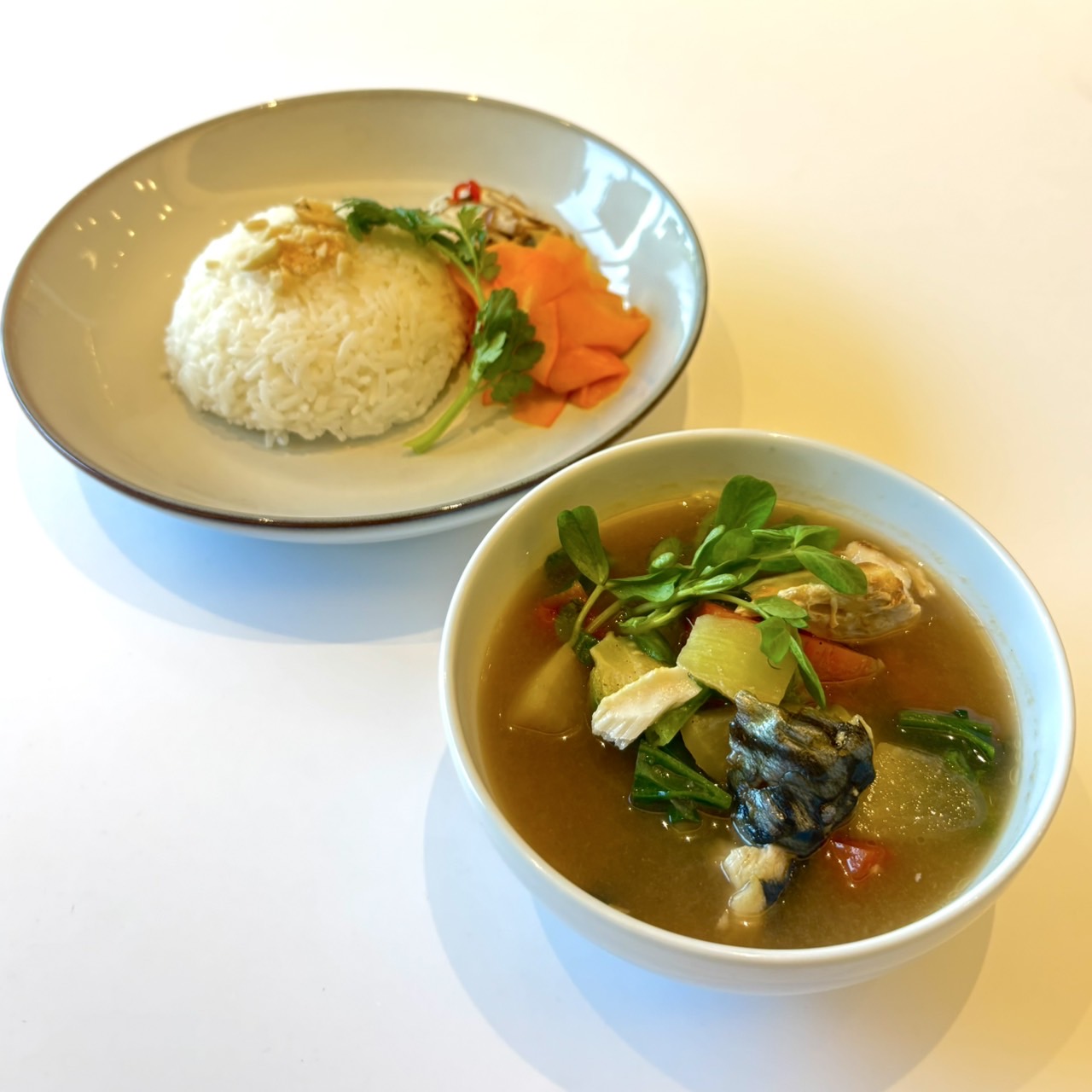 胡椒や海老ペースト(カピ)をベースにした、野菜がたっぷりのタイの伝統的なスープです。今回は鯖を使用。 ココナッツミルクを使わないクリアなスープで、胡椒の辛さと野菜の旨味が特徴的です。 ※アレルゲン : サバ、エビ、ピーナッツ