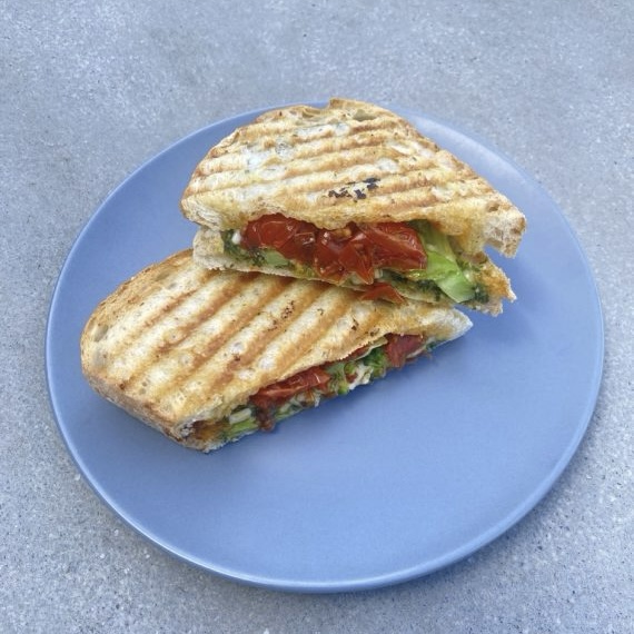 【MIDTOWN OPEN THE PARK 2026掲載商品】 自家製のセミドライトマトと青唐辛子がピリッと効いたケールのジェノベーゼホットサンド。 BOULANGERIE BURDIGALA(ブーランジェリー ブルディガラ)の動物性食品不使用のパンを使用。 ※ヴィーガン ※アレルゲン:小麦、大豆 ※在庫状況により、品切れの場合がございます。