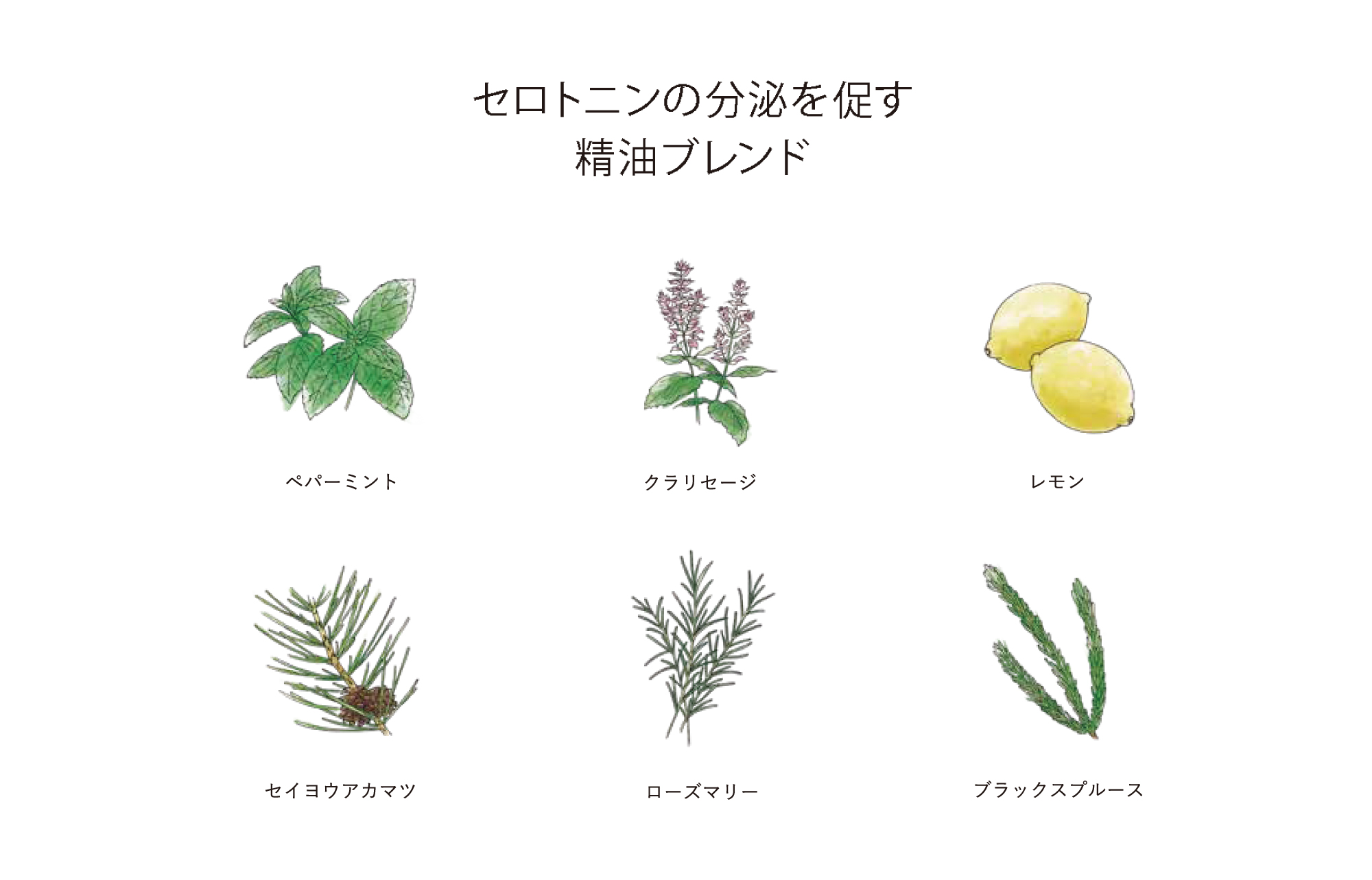 ペパーミント、クラリセージ、レモン、パイン(セイヨウアカマツ)、ローズマリー、ブラックスプルースの精油 シナラオイル:保湿 ウチワサボテンオイル:保湿