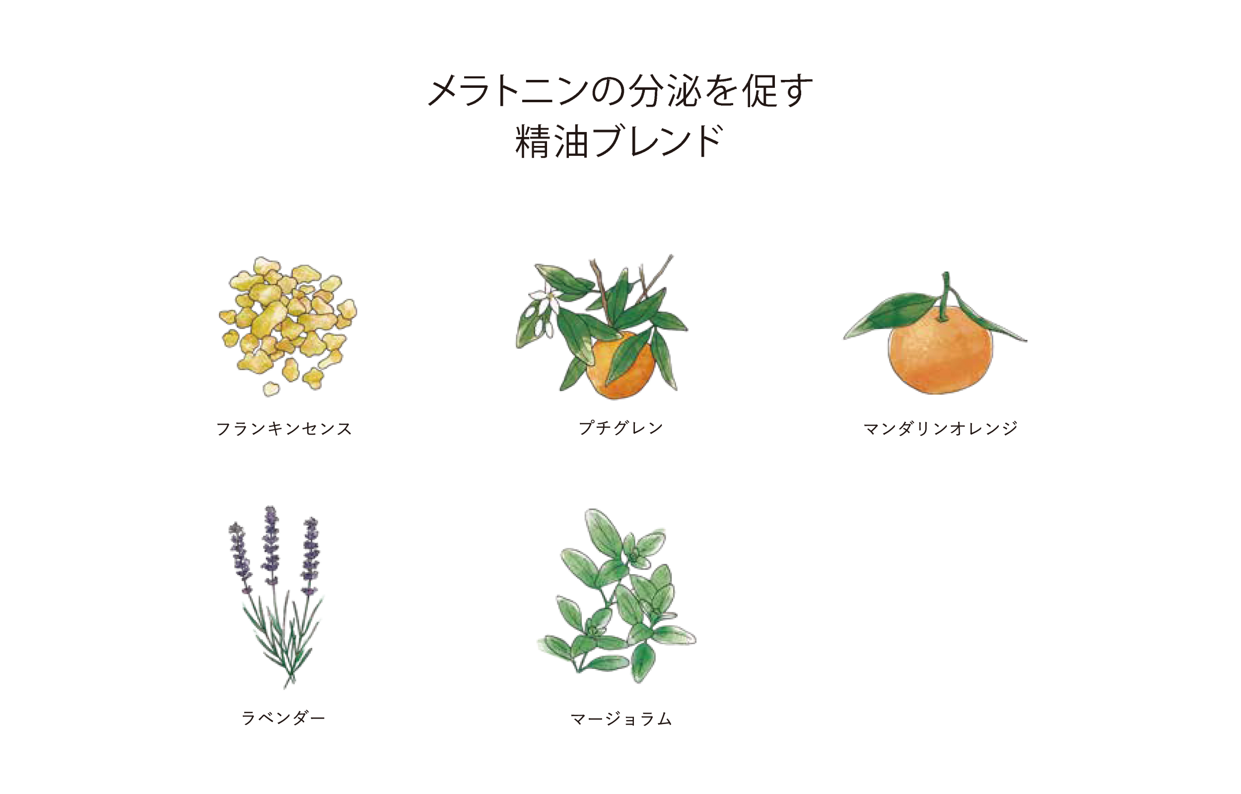 フランキンセンス、プチグレン、マンダリンオレンジ、ラベンダー、マジョラムの精油 シナラオイル: 保湿 ボラージオイル:保湿