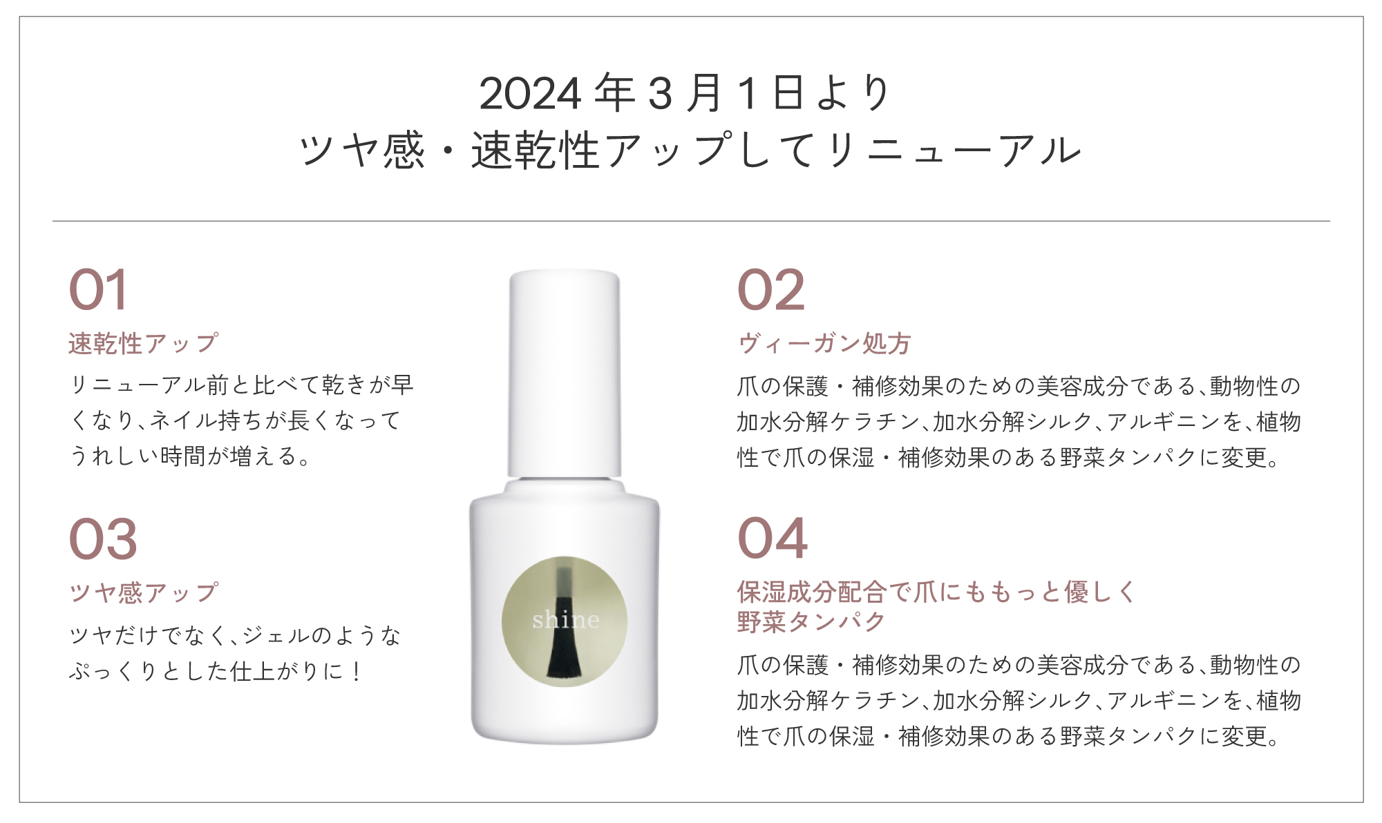 【shine】の名前の通り、よりジェルトップコートのようなツヤ感と速乾性がアップ。そしてヴィーガン処方へ。