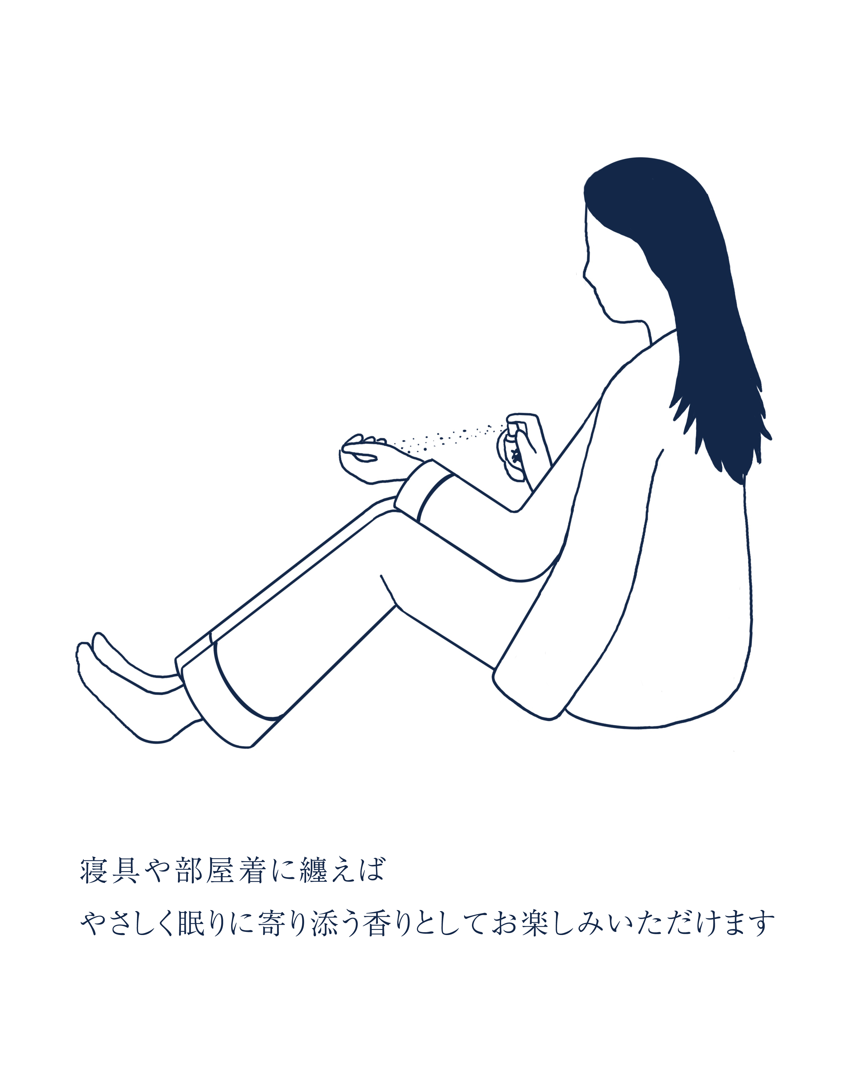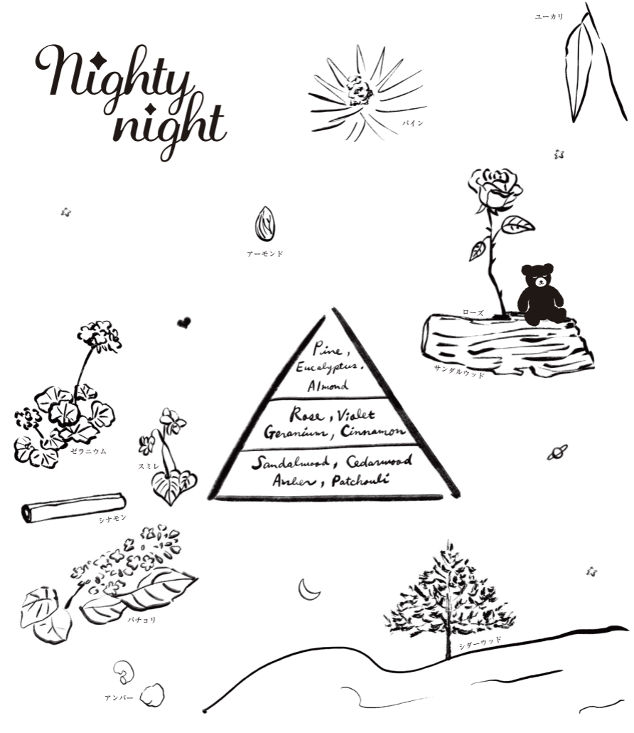 最初に立ち上がるのは、パインとユーカリの透明感ある清涼感。 そこへアーモンドのまろやかな甘さが重なり、ピュアでありながら柔らかい印象に。 時間が経つと、ローズやスミレの華やかなフローラルが広がり、ゼラニウムのグリーン感とシナモンの温かみがアクセントに。 最後に漂うのは、サンダルウッドやシダーウッドのウッディな深み。そこへアンバーの温もりとパチョリのアーシーさが重なり、夜の静けさと包容力を感じる余韻に。 清らかな透明感から花々のやさしさ、そしてウッディの深い静けさへ。時間とともに表情を変える、落ち着きと安らぎのフレグランス。 夜の静けさを思わせ、ゆったりと穏やかな気分に。