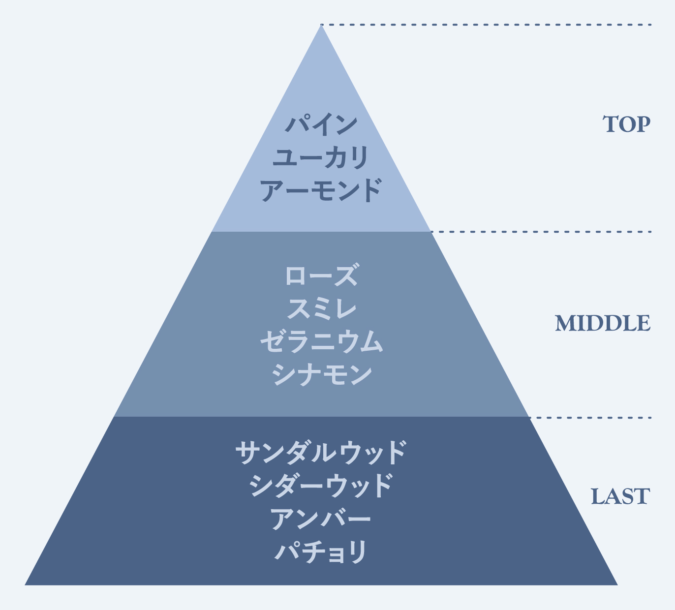トップ:パイン、ユーカリ、アーモンド ミドル:ローズ、スミレ、ゼラニウム、シナモン ラスト:サンダルウッド、シダーウッド、アンバー、パチョリ