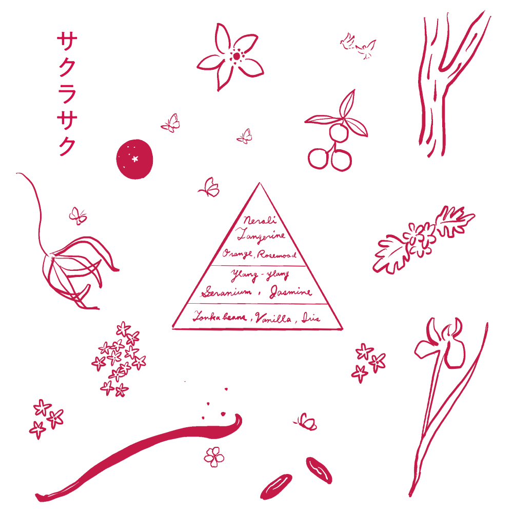 ひと吹きした瞬間、ネロリやタンジェリン、オレンジの明るいシトラスが軽やかに広がり、空気をすっと澄ませます。 ローズウッドのやわらかなウッディノートが奥行きを添え、穏やかな印象へ。 やがて、イランイラン、ゼラニウム、ジャスミンの花々が重なり、 サクラがほころぶ瞬間のような、華やかでやさしい香りへと移ろいます。 ラストは、トンカビーンズとバニラ、イリスのまろやかな甘さが肌に寄り添い、桜餅を思わせる、やさしい余韻を残します。 トップ:ネロリ、タンジェリン、ローズウッド、オレンジ ミドル:イランイラン、ゼラニウム、ジャスミン ラスト:トンカビーンズ、バニラ、イリス