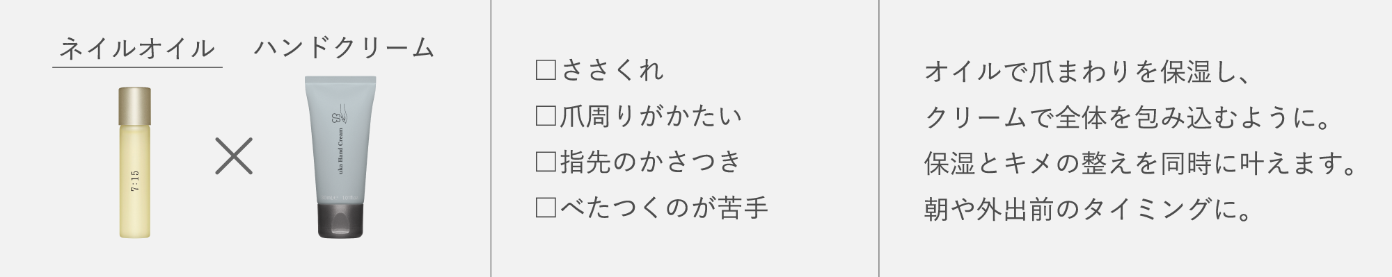 - ネイルオイルを爪や爪まわりに。保湿・保護をしてツヤと弾力を与えます。