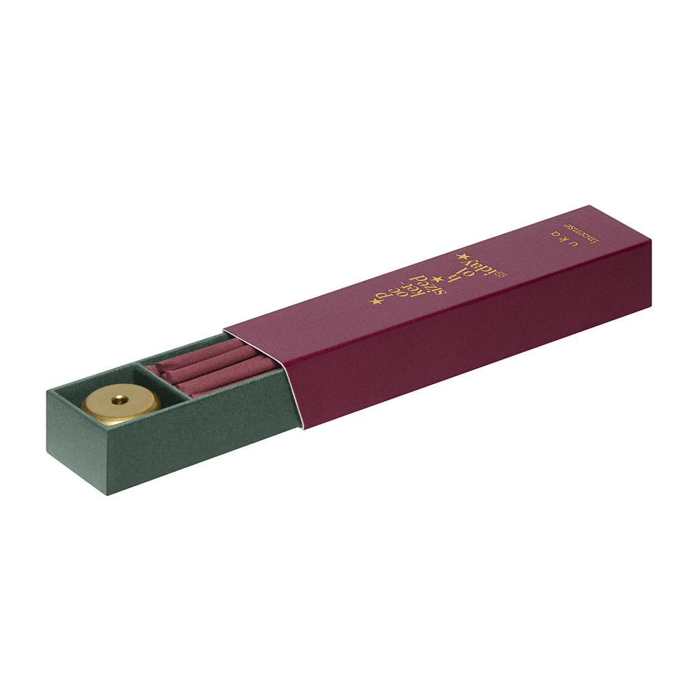 「pocket-sized holiday」シリーズから登場するお香は、日常に寄り添うショートサイズ。 燃焼時間は約15〜20分とコンパクトで、朝の支度や夜のリラックスタイムなど、ほんのひとときの時間を心地よい香りで満たしてくれます。 スライド式のボックスには、インセンスと専用ホルダーをセットで収納。 コンパクトながら実用的で、持ち運びにも便利なデザインです。 小さなサイズの中に、心を解きほぐす豊かな香りとホリデーの高揚感をぎゅっと詰め込んだインセンスです。