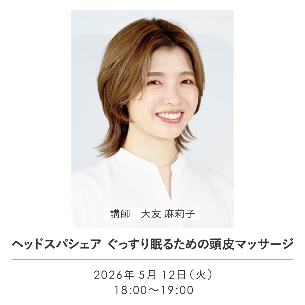 睡眠の質がよくなりぐっすり眠るための頭皮マッサージやポイントをシェア(伝授)します。 【日時】 2026年5月12日(火) 18:00~19:00 【定員】 8名 【講師】 uka ヘッドスパリスト 大友麻莉子 【お渡しする商品】 ・uka sleep mist for NORDIC SLEEP 1種 ・uka IZU mask for scalp&hair 'Anti-Itch' 50mL Tube 注文完了通知の画面を当日スタッフにお見せください。