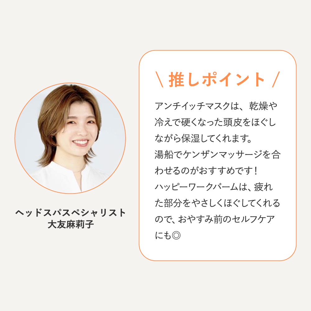 ukaのヘッドスパスペシャリスト・大友がセレクトした2アイテムで、頭皮と身体の「めぐり」と「潤い」を整え、冬のコンディションケアをサポートします。