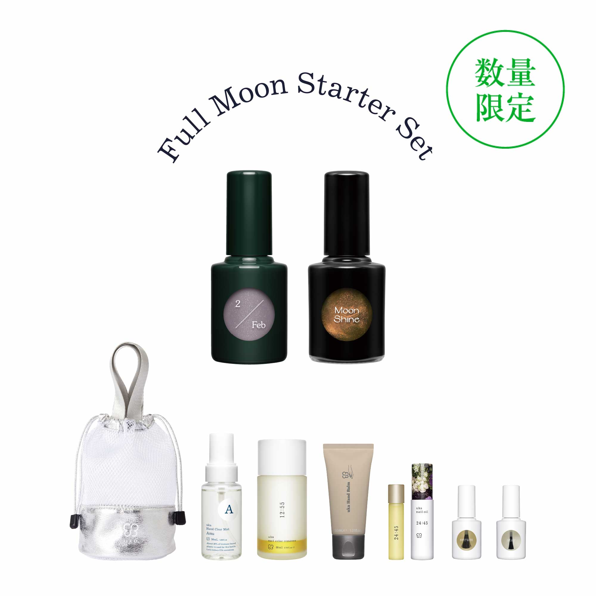 ムーンスタディシリーズの新色ネイルポリッシュと、満月の光を纏うトップコート ムーンシャインを中心に、爪先・手肌をトータルでケアできるuka製品8点を厳選しました。