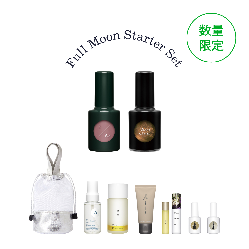 ムーンスタディシリーズの新色ネイルポリッシュと、満月の光を纏うトップコート ムーンシャインを中心に、爪先・手肌をトータルでケアできるuka製品8点を厳選しました。 保湿、補修、除去、彩り、仕上げまでをこのセットひとつで。爪を整え、磨き上げるネイルファイルとネイルシャイナーも。 更に収納時にも役立つメッシュ巾着バッグ付き!自爪を労わりながら、健やかで美しい爪を育てたい方におすすめのスターターセットです。 単品で揃えるより3,960円もお得です。