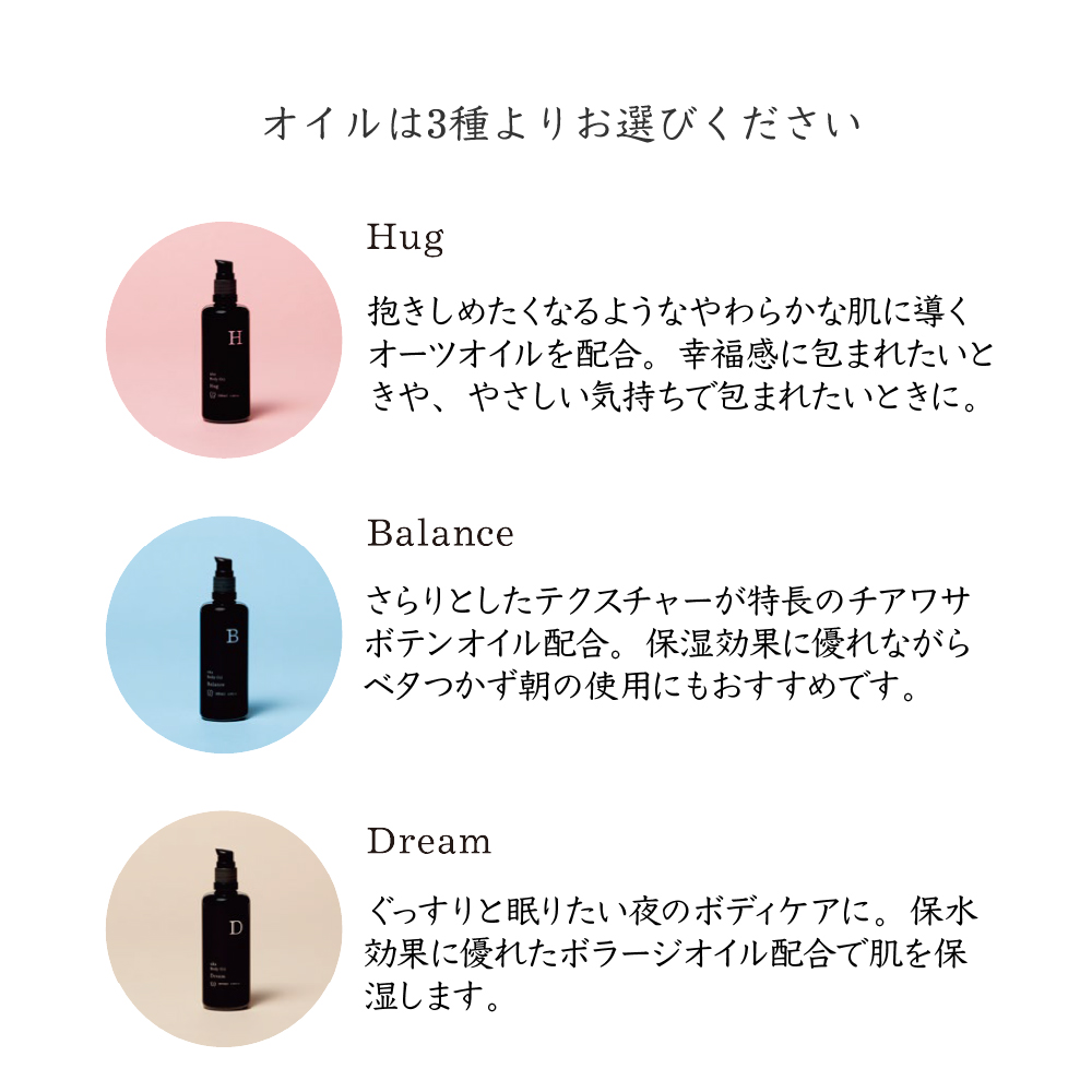 目まぐるしく変化する日常で乱れがちなリズムに着目し、忙しくても自分を大切にしたい大人のためにブレンドしたオリジナルボディオイル。