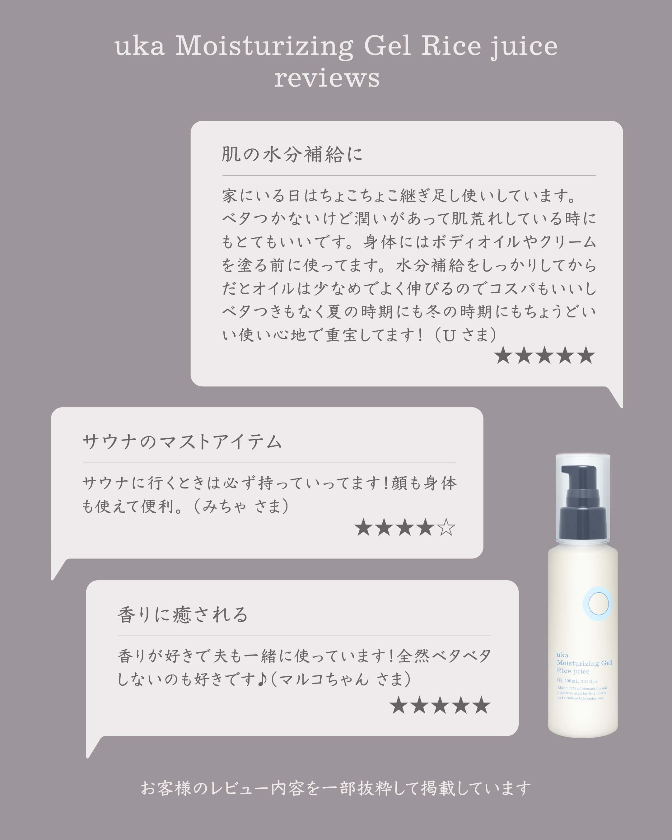 - uka Moisturizing Gel Rice juice 発酵ライスジュースで、しっとり健やかな肌へ