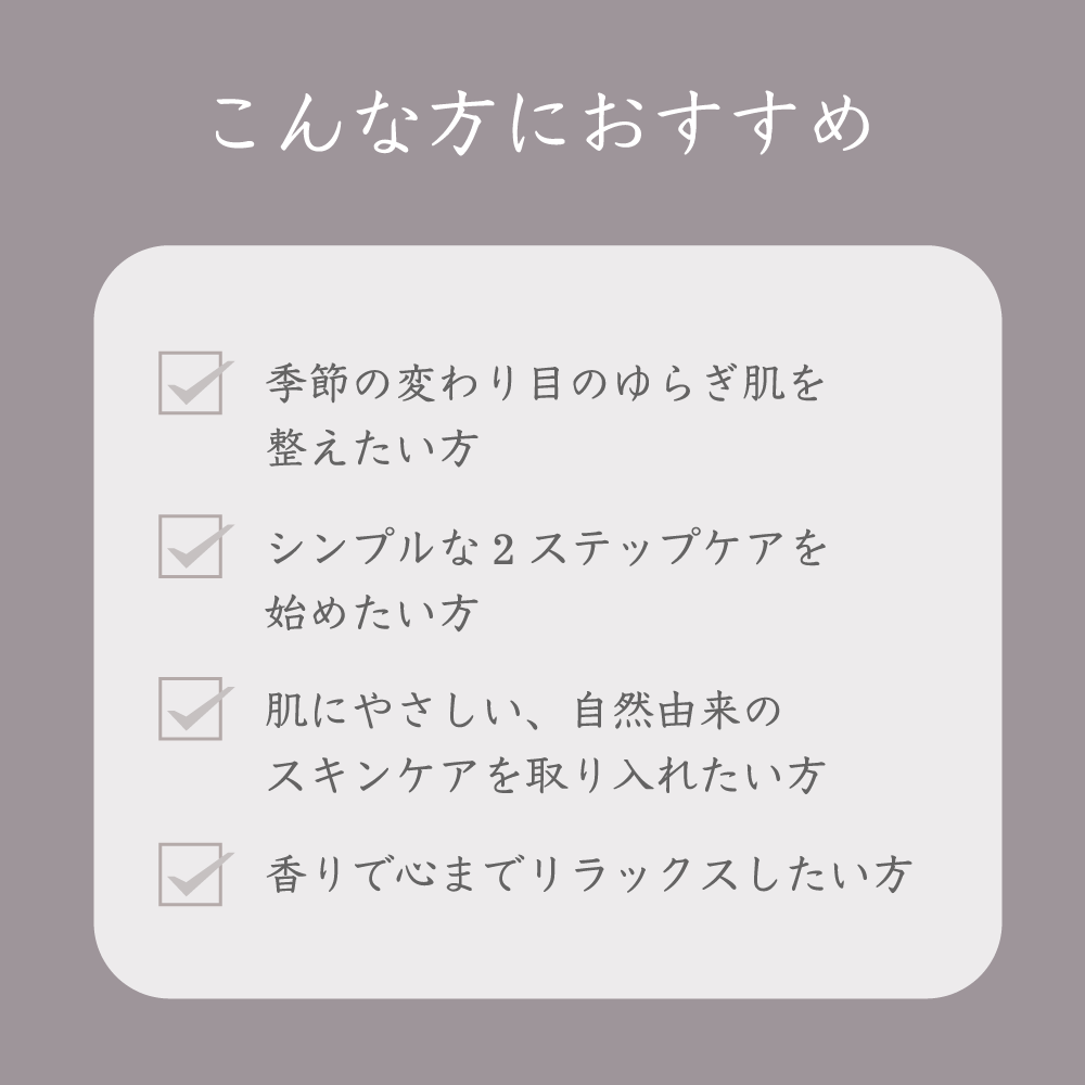 エアコンをつけはじめて乾燥が気になり使っています。2つともさっぱりとした付け心地なのに保湿される感じが分かるので気に入っています。ミストの方は、家族もクロモジのいいにおいがする!と気付いてくれるほどで自然な香りにも癒されます。