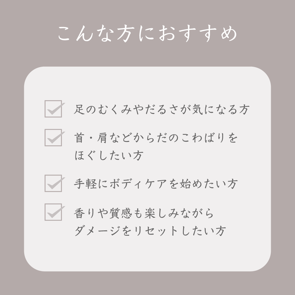 乾燥やごわつきがちなかかとをなめらかに整え、むくみや重だるいふくらはぎをすっきり。