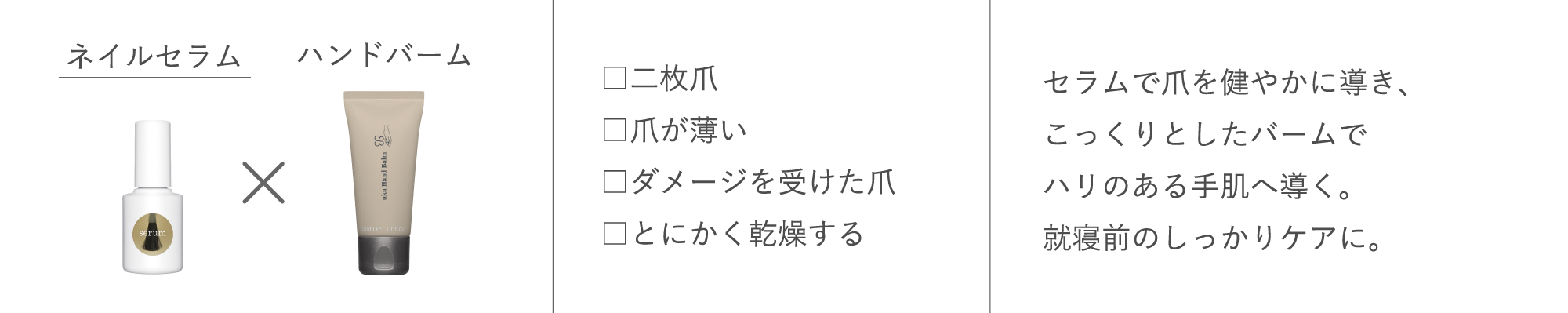 - ネイルセラムで爪のケアを。爪の縦割れや薄さにアプローチし、健やかに導きます。