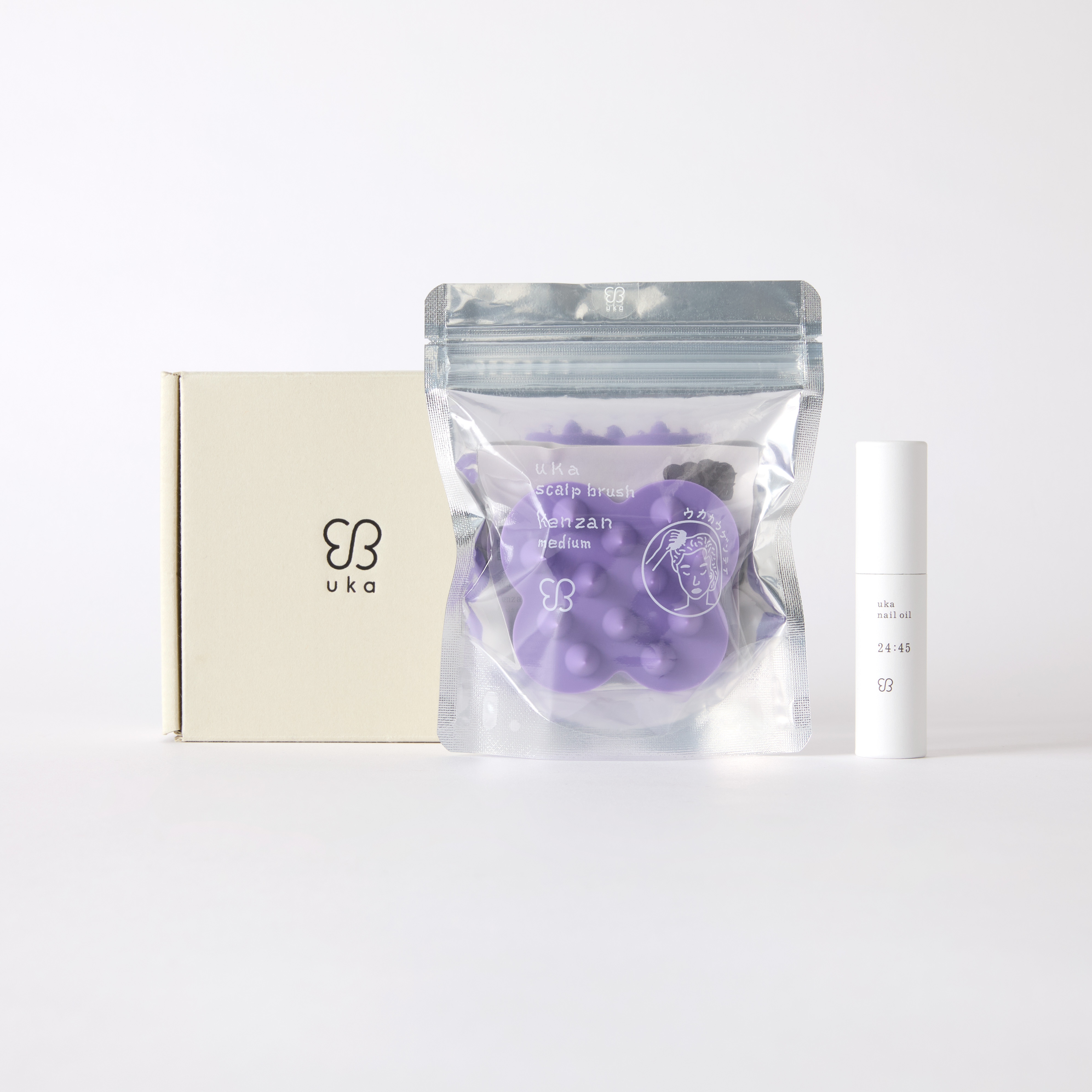 小さなSボックスに収まるサイズで、気軽に渡したい方にも。ケンザンは柔らかすぎず、硬すぎないほどよい硬さのウカカウ限定カラーのパープルのミディアム。ネイルオイルは人気のラベンダーとバニラの優しく包まれるような香りの24:45