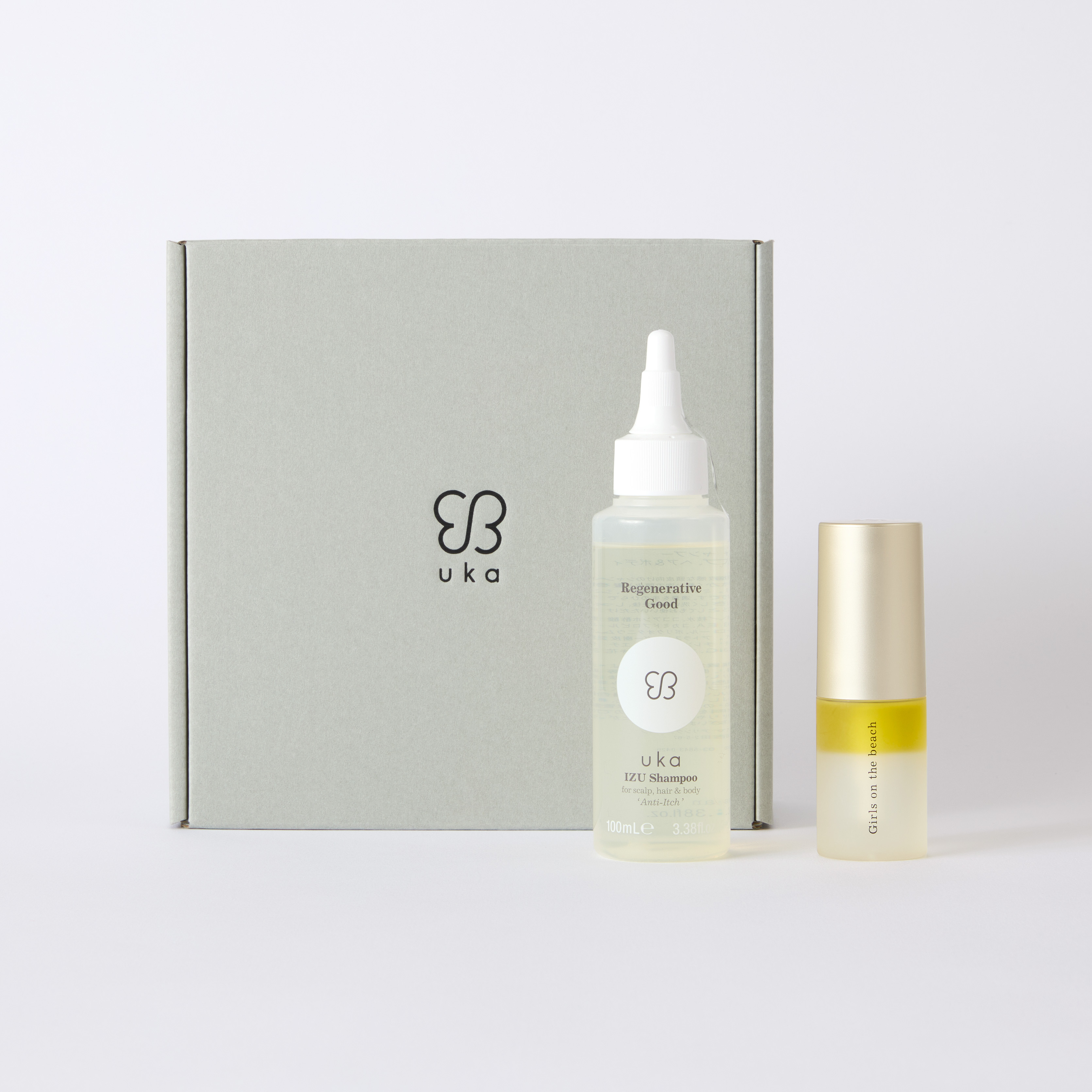 【uka IZU Shampoo for scalp,hair&body 'Anti-Itch' 100mL Bottle】 ミント、ローズマリー、シダーウッドのブレンドで清涼感の中に少しだけ甘さも。 【uka hair oil mist Girls on the beach 30mL】 陽気な気持ちを高めてくれるすっきりとしたミントをプラスした甘いバニラ調の香り。