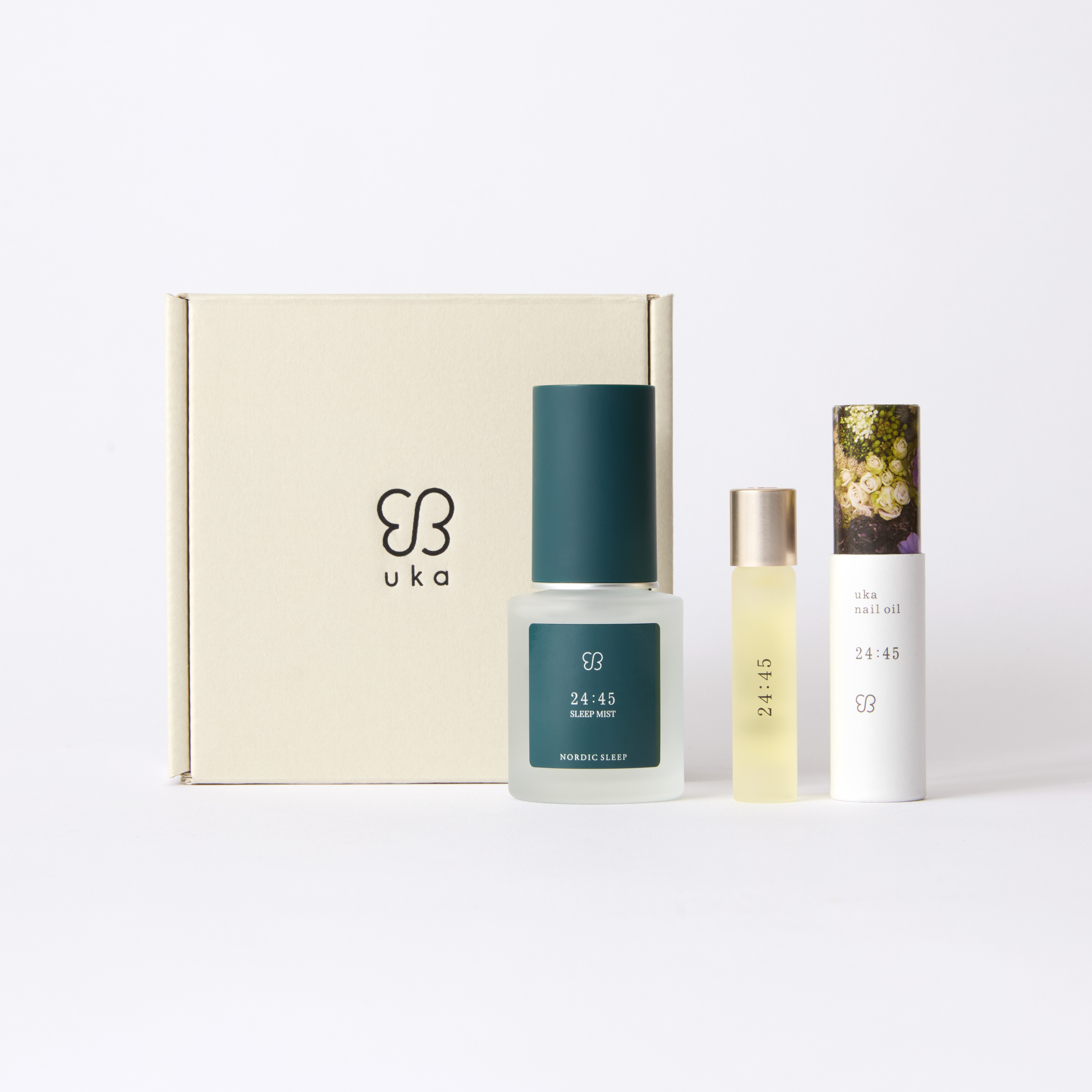 【uka nail oil 24:45】 ラベンダーにバニラ調の香りとオレンジの香り。 【uka sleep mist 24:45 for NORDIC SLEEP】 ラベンダーとバニラの穏やかな香り。