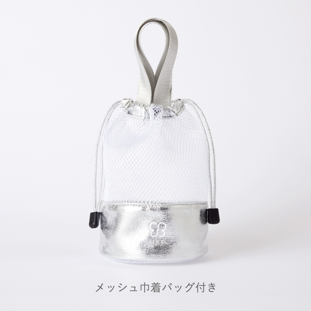 - uka メッシュ巾着バッグ トレンド感のあるシルバーカラー×メタリック素材を使用した巾着バッグは、通気性の良いメッシュ素材。